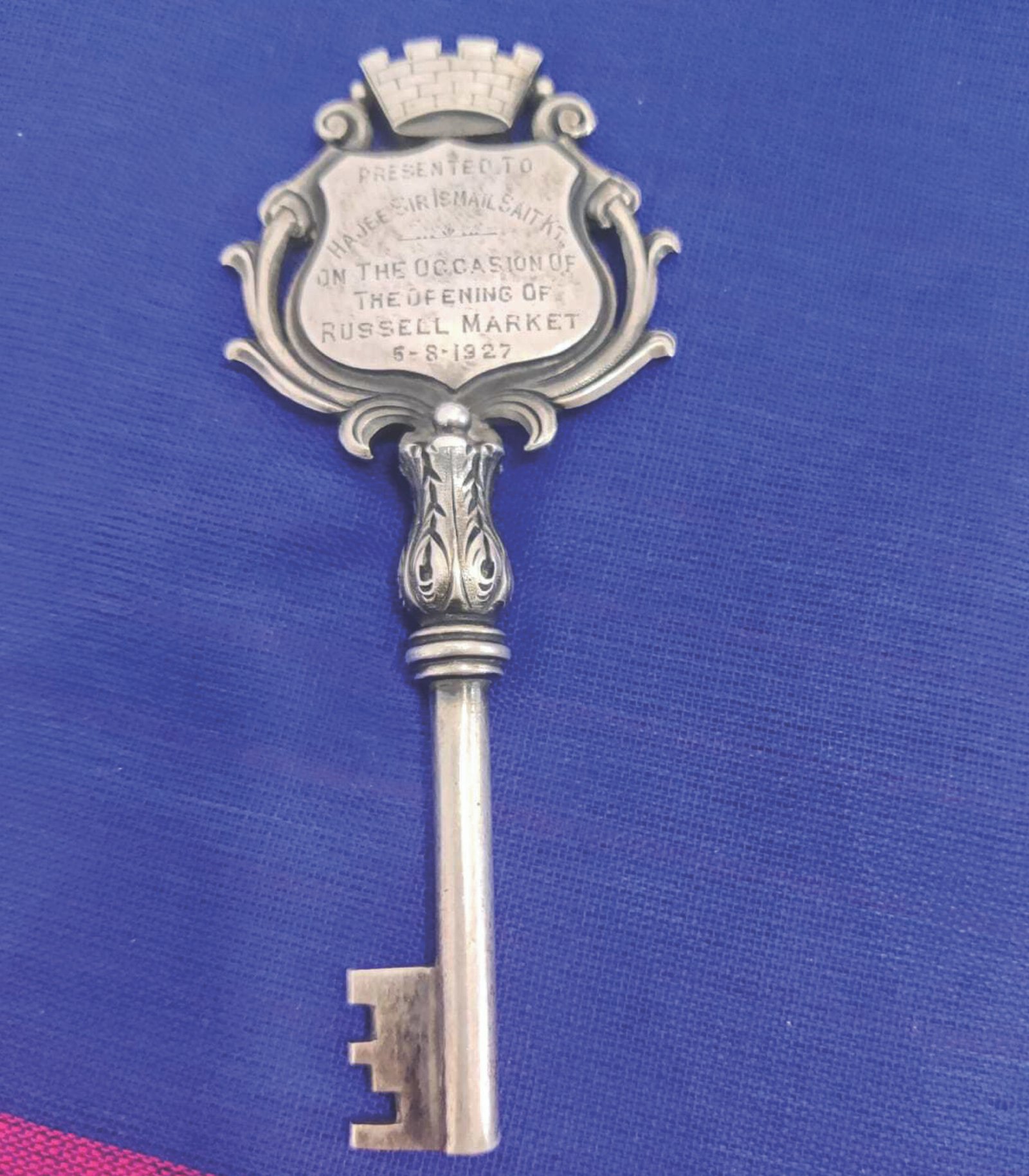 This commemorative silver key was presented to Hajee Sir Ismail Sait on 5 August 1927 during the inauguration of Bangalore’s iconic Russell Market.