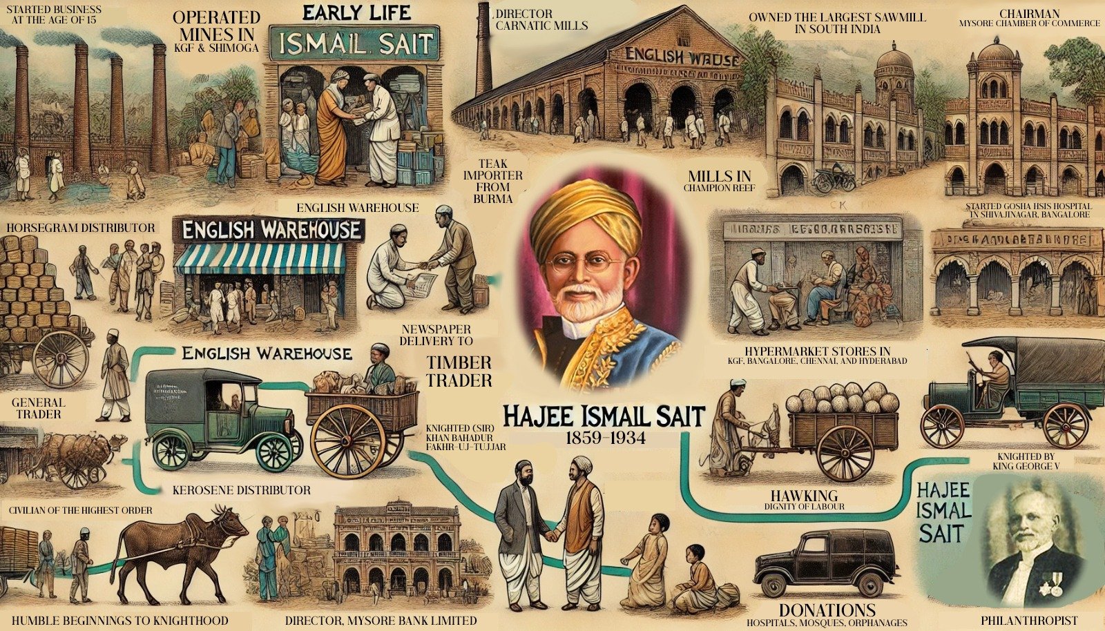 Hajee Sir Ismail Sait (1859–1934) was born into hardship, worked as a newspaper boy, sold goods door-to-door, and had no formal schooling.